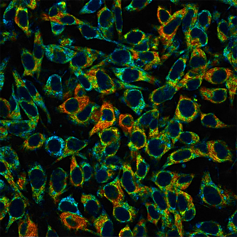 Here scientists captured the autofluorescence of NAD(P)H, a molecule involved in many metabolic reactions, in mouse melanoma cells.